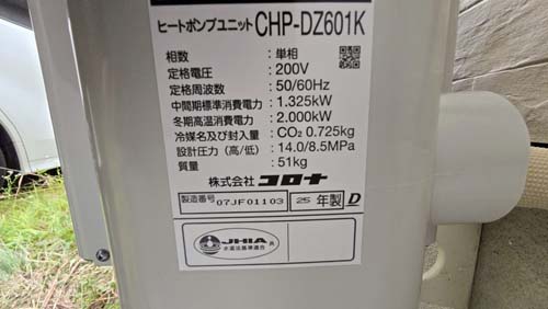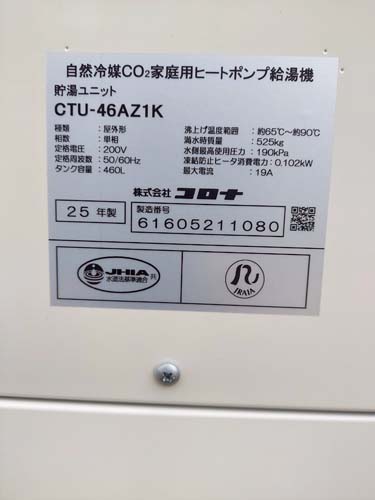 湯沢市表町 コロナ自然冷媒CO2家庭用ヒートポンプ給湯機 ヒートポンプユニットCHP-DZ601K、貯湯ユニットCTU-46AZ1K エコキュート交換工事